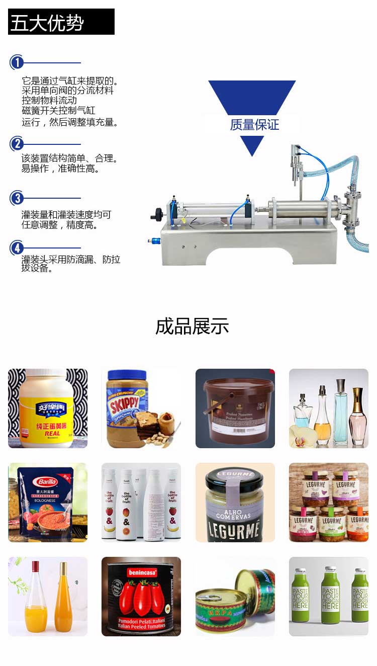 該粘稠液體灌裝機(jī)主要適用于有一定流動(dòng)性液體、粘稠液體的定量灌裝如:醬油、蜂蜜、油脂、糖漿、果醬、調(diào)味醬、洗發(fā)液、護(hù)膚品等,適用于食品、醫(yī)藥、化妝品等行業(yè)。