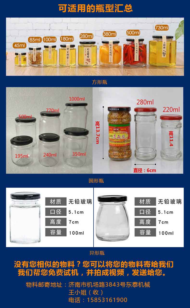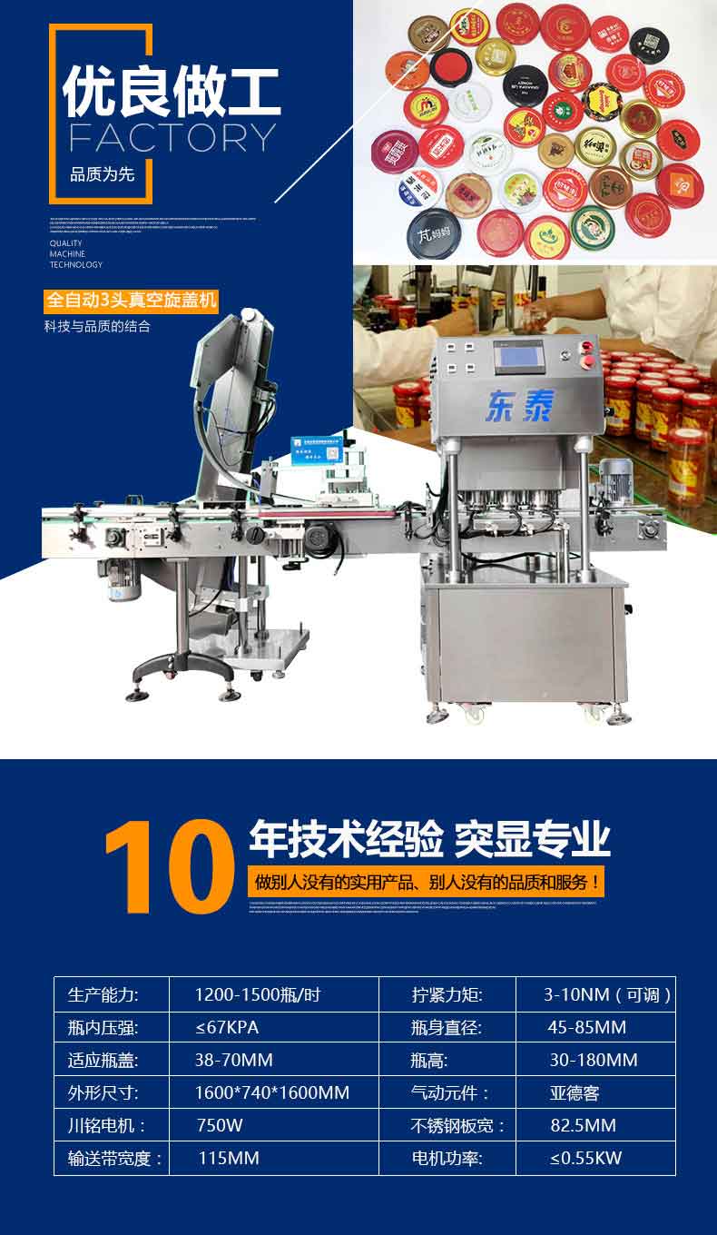 智能化全自動真空旋蓋機是專門針對玻璃瓶鐵蓋設(shè)計的一款設(shè)備。玻璃瓶口是帶螺旋的,蓋子材質(zhì)通常是馬口鐵,帶有和對應(yīng)瓶口螺紋條數(shù)相等的扣,根據(jù)不同的瓶口直徑標準規(guī)定為三、四、六扣的蓋子,分別配套對應(yīng)數(shù)量螺口玻璃瓶。廣泛適用于食品飲料、調(diào)味品、保健品筆各行業(yè)中各種三(四)旋蓋玻璃瓶的真空旋蓋。
