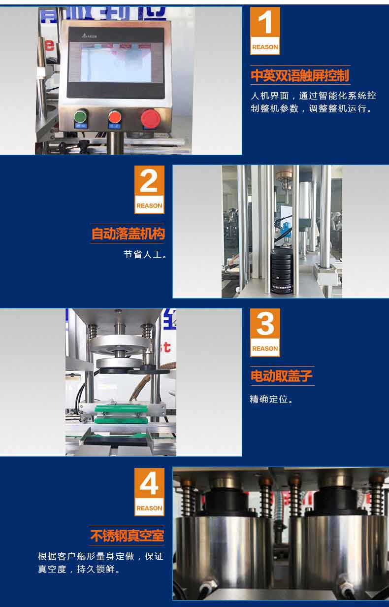 3、屬全自動機型,既可人工配蓋,人工進出瓶,手動關(guān)閉真空室;也可配備上蓋機進行自動化的生產(chǎn)操作。