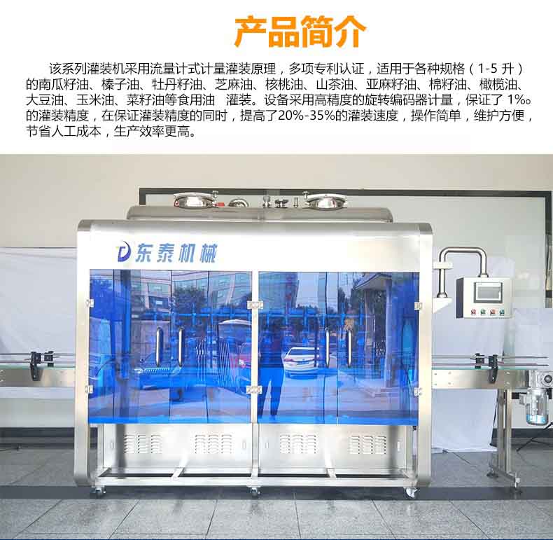 該系列灌裝機采用流量計式計量灌裝原理,多項專利認證,適用于各種規(guī)格(1-5升)的南瓜籽油、榛子油、牡丹籽油、芝麻油、山茶油、亞麻籽油、棉籽油、橄欖油、大豆油、玉米油、菜籽油等食用油灌裝。設備采用高精度的旋轉(zhuǎn)編碼器計量,保證了1%的灌裝精度,在保證灌裝精度的同時,提高了20%-35%的灌裝速度,操作簡單,維護方便,節(jié)約人工成本,生產(chǎn)效率更高。