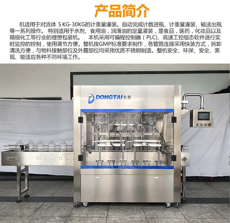 機(jī)適用于對(duì)流體10kg-30kg的計(jì)重量灌裝。自動(dòng)完成計(jì)數(shù)進(jìn)瓶、計(jì)重量灌裝、輸送出瓶等一系列操作。 特別適用于水劑、食用油,潤(rùn)滑油的定量灌裝,是食品,醫(yī)藥,化妝品以及精細(xì)化工等行業(yè)的理想包裝機(jī)!”緳C(jī)采用可編程控制器(PLC)、高速工控組態(tài)軟件進(jìn)行實(shí)時(shí)監(jiān)控的控制,使用調(diào)節(jié)方便。整機(jī)按GMP標(biāo)準(zhǔn)要求制作,各管路連接采用快裝方式,拆卸清洗方便,與物料接觸部位及外露部位均采用優(yōu)質(zhì)不銹鋼制造。整機(jī)安全、環(huán)保、安全、美觀、能適應(yīng)各種不同環(huán)境工作。