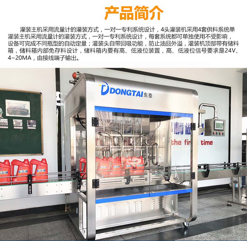 6. 灌裝頭為國家專利產(chǎn)品,專利獲得者為東泰公司,獨(dú)有的雙重防滴漏,灌裝下料口設(shè)計(jì)精細(xì),行程短,同時(shí)也提高了整條線的灌裝速度和灌裝精度,保證在正常灌裝過程中一滴油都不會(huì)滲漏