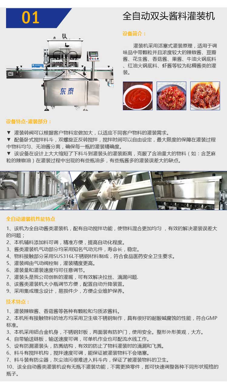 1、該機為全自動醬類灌裝機,配有自動攪拌功能,使物料混合更加均勻 ,有效的解決灌裝誤差大的問題;