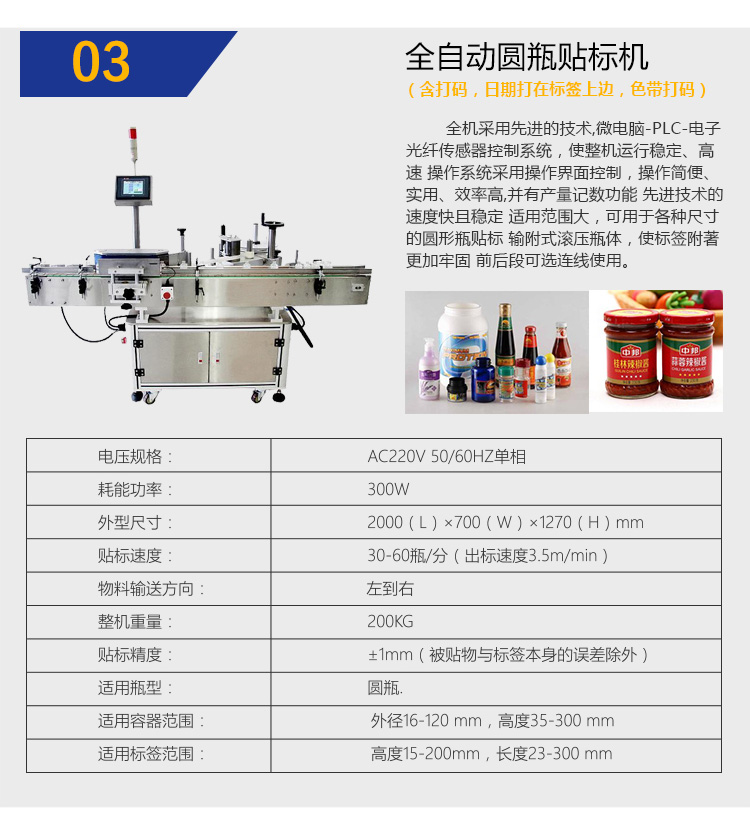 全機采用先進的技術(shù),微電腦-PLC-電子光纖傳感器控制系統(tǒng),使整機運行穩(wěn)定、高速 操作系統(tǒng)采用操作界面控制,操作簡便、實用、效率高,并有產(chǎn)量記數(shù)功能 先進技術(shù)的速度快且穩(wěn)定 適用范圍大,可用于各種尺寸的圓形瓶貼標 輸附式滾壓瓶體,使標簽附著更加牢固 前后段可選連線使用.