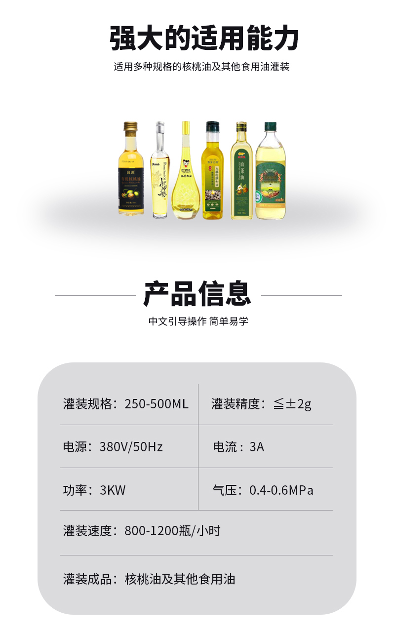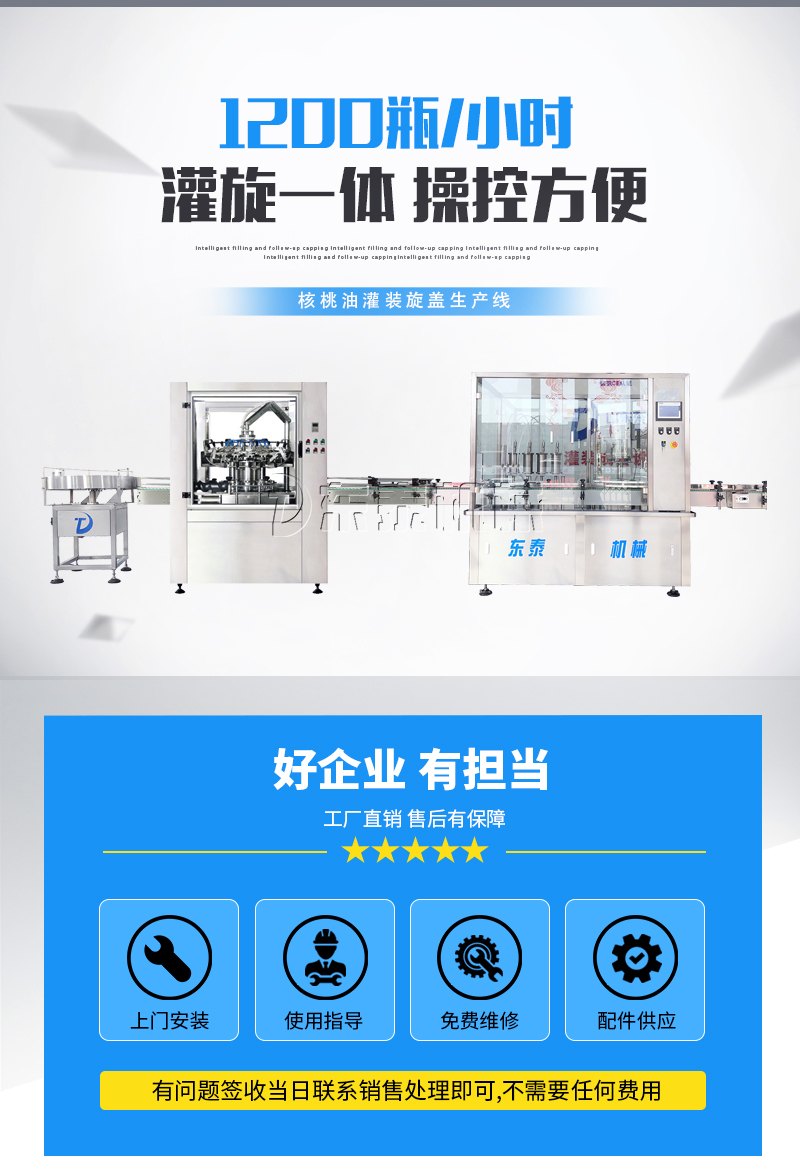 全自動核桃油灌裝流水線設(shè)備具有穩(wěn)定可靠、自動化水平高,相比同類產(chǎn)品有著更長的使用年限,維護(hù)簡單,整線中各設(shè)備的協(xié)調(diào)性、連貫性強(qiáng),整線設(shè)計合理等特點。灌裝設(shè)備采用獨家專利系統(tǒng)結(jié)構(gòu),為當(dāng)今