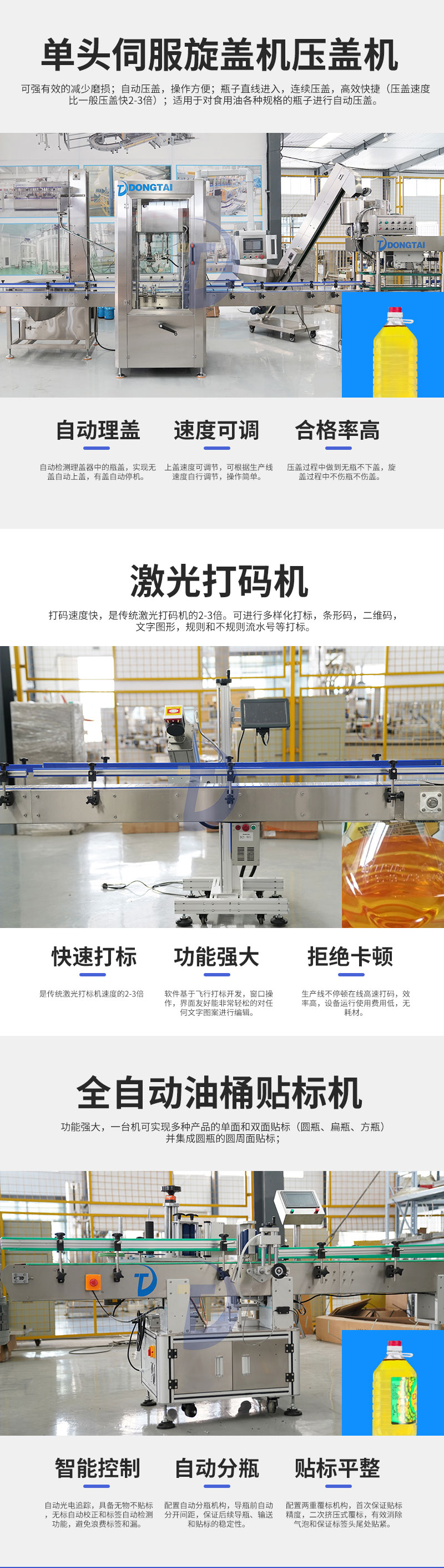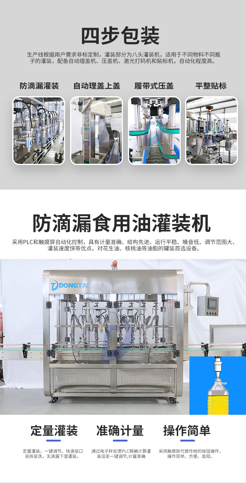 山東東泰機(jī)械制造有限公司是小包裝油類(lèi)包裝線、軟包裝油類(lèi)灌裝機(jī)、溶液灌裝機(jī)、填充機(jī)及后段包裝設(shè)備、工業(yè)機(jī)器人等產(chǎn)品專(zhuān)業(yè)生產(chǎn)加工的公司,擁有完整、科學(xué)的質(zhì)量管理體系。 山東東泰機(jī)械制造有限公司的誠(chéng)信、實(shí)力和產(chǎn)品質(zhì)量獲得業(yè)界的認(rèn)可。 歡迎各界朋友蒞臨參觀、指導(dǎo)和業(yè)務(wù)洽談。