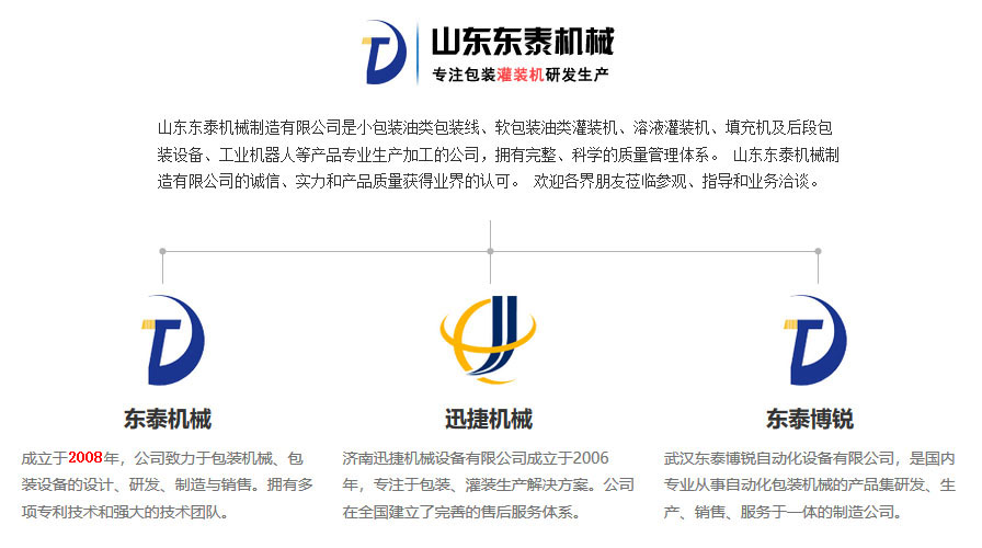 山東東泰機(jī)械制造有限公司是小包裝油類包裝線、軟包裝油類灌裝機(jī)、溶液灌裝機(jī)、填充機(jī)及后段包裝設(shè)備、工業(yè)機(jī)器人等產(chǎn)品專業(yè)生產(chǎn)加工的公司,擁有完整、科學(xué)的質(zhì)量管理體系。 山東東泰機(jī)械制造有限公司的誠(chéng)信、實(shí)力和產(chǎn)品質(zhì)量獲得業(yè)界的認(rèn)可。 歡迎各界朋友蒞臨參觀、指導(dǎo)和業(yè)務(wù)洽談。