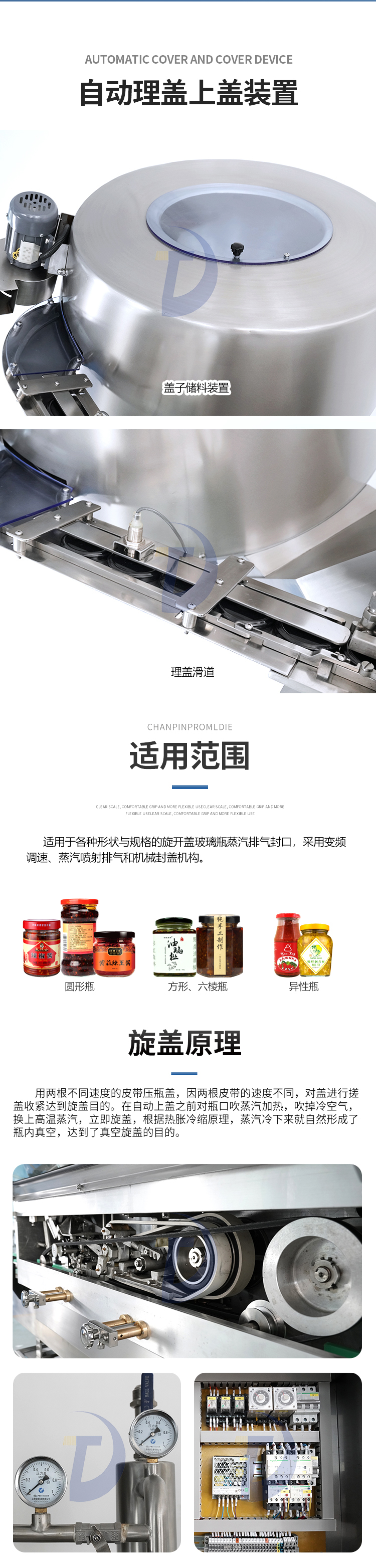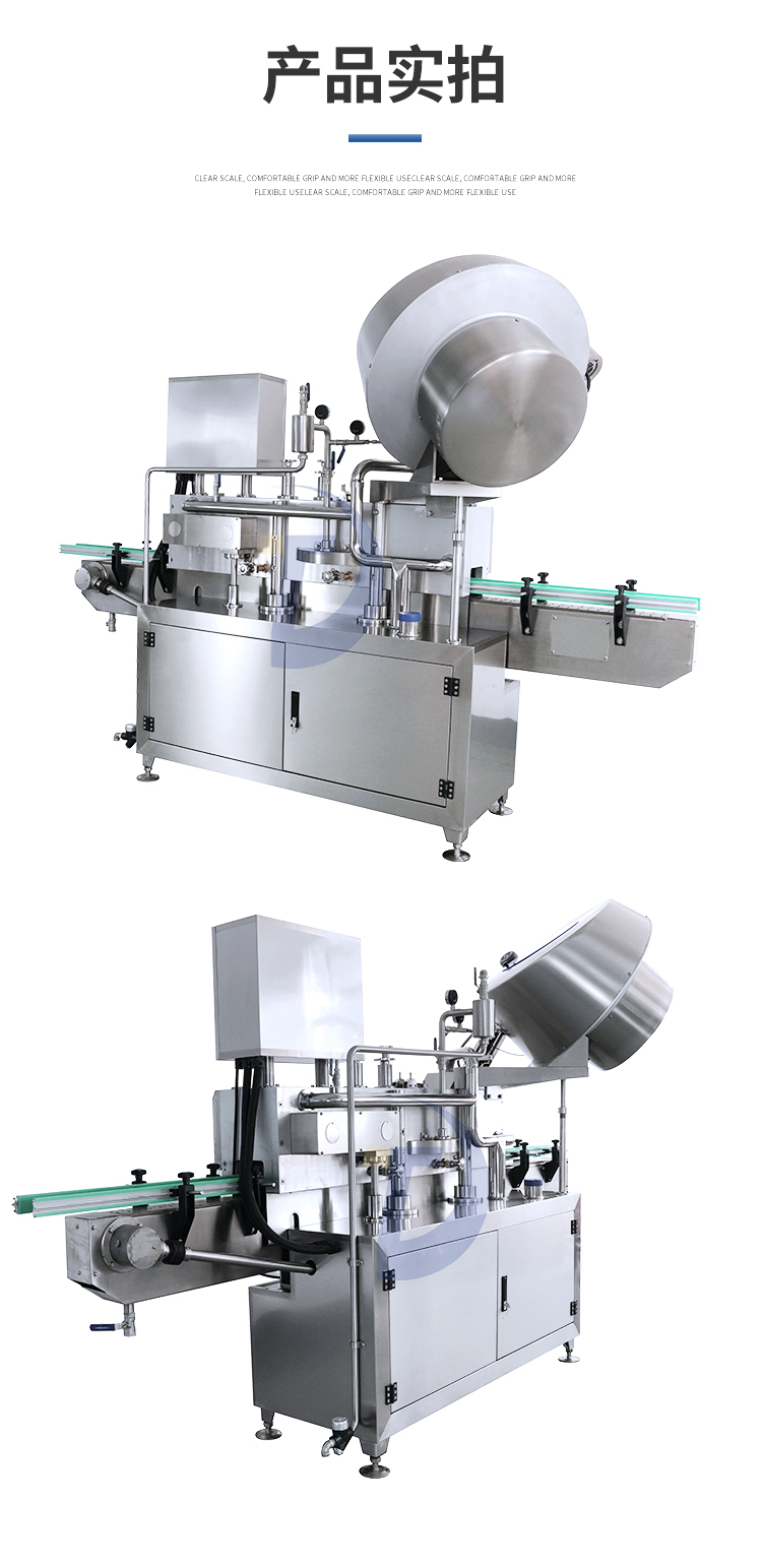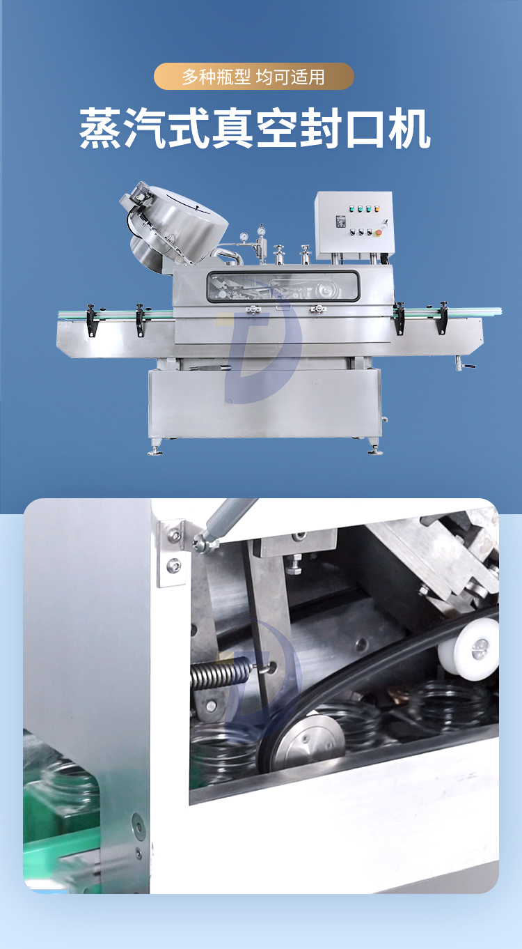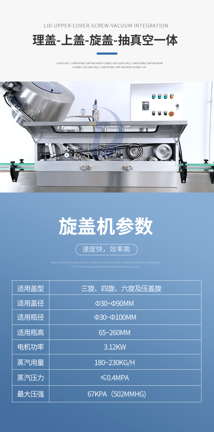 蒸汽式真空旋蓋機的主要特點:自動旋蓋機主要用于玻璃廣口瓶的三、四、六鐵蓋真空旋蓋,用兩根不同速度的皮帶壓瓶蓋,因兩根皮帶的速度不同,對蓋進行搓蓋收緊達到旋蓋目的。在自動上蓋之前對瓶口吹蒸汽加熱,吹掉冷空氣,換上高溫蒸汽,立即旋蓋,根據(jù)熱脹冷縮原理,蒸汽冷下來就自然形成了瓶內(nèi)真空,達到了真空旋蓋的目的。自動旋蓋機可以和濃醬灌裝機、蜂蜜灌裝機、辣椒醬灌裝機組合在一起,形成一套全自動灌裝設(shè)備,是現(xiàn)代調(diào)味品企業(yè)的得力幫手。